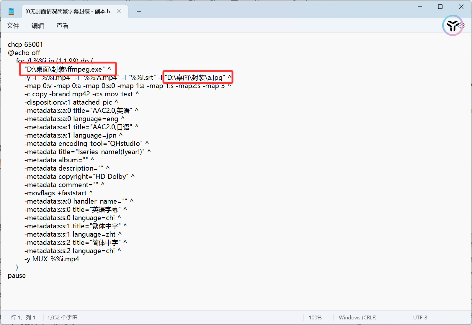 set "ffmpeg_location=D:\桌面\封装\ffmpeg.exe"