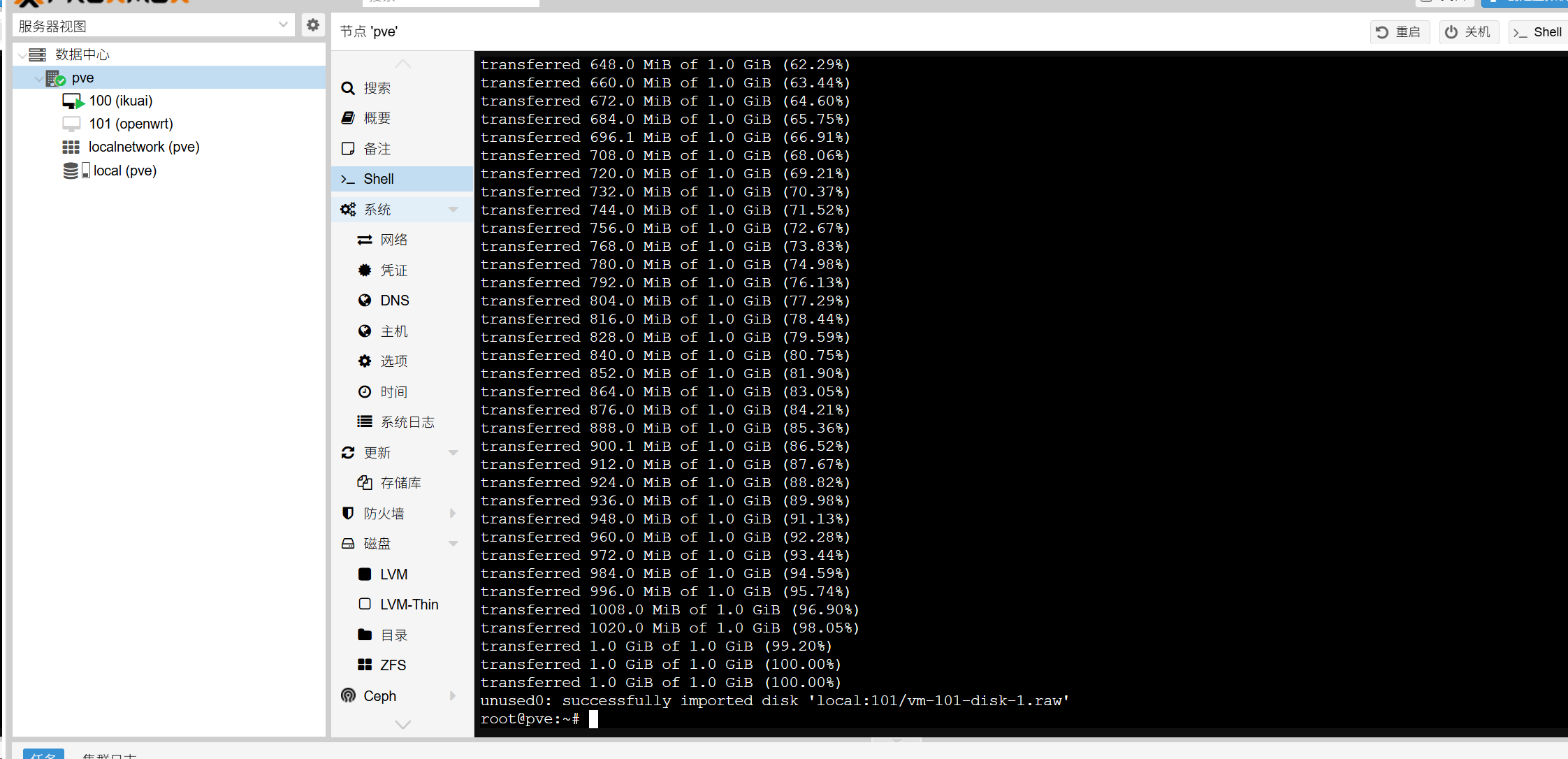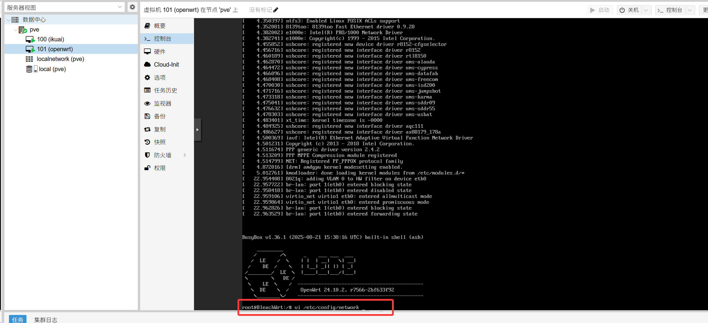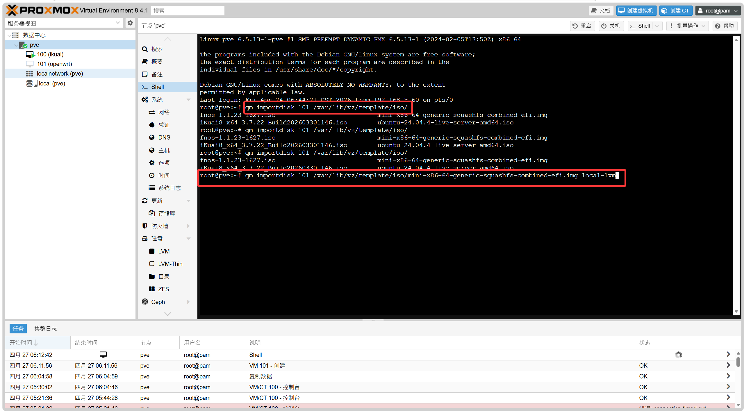 qm importdisk 101 /var/lib/vz/template/iso/plus-x86-64-generic-squashfs-combined-efi.img local虚拟机id为,左侧pve下100 (ikuai) 101 (openwrt)