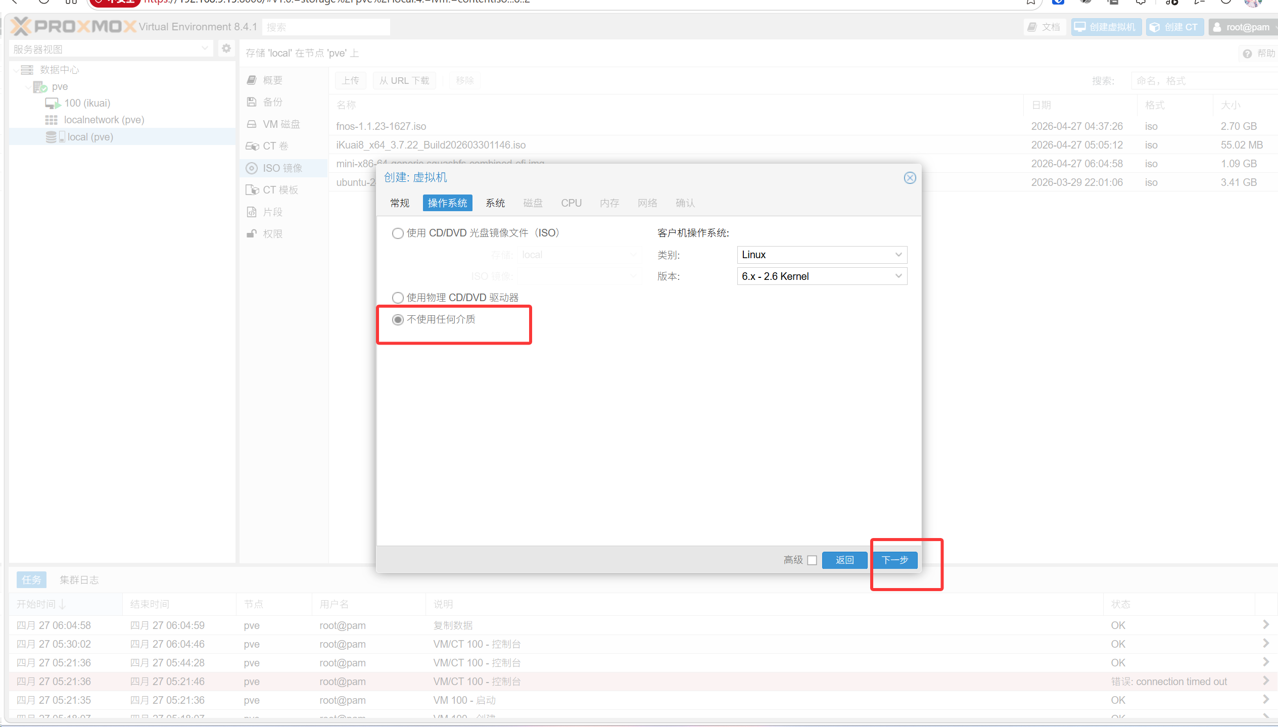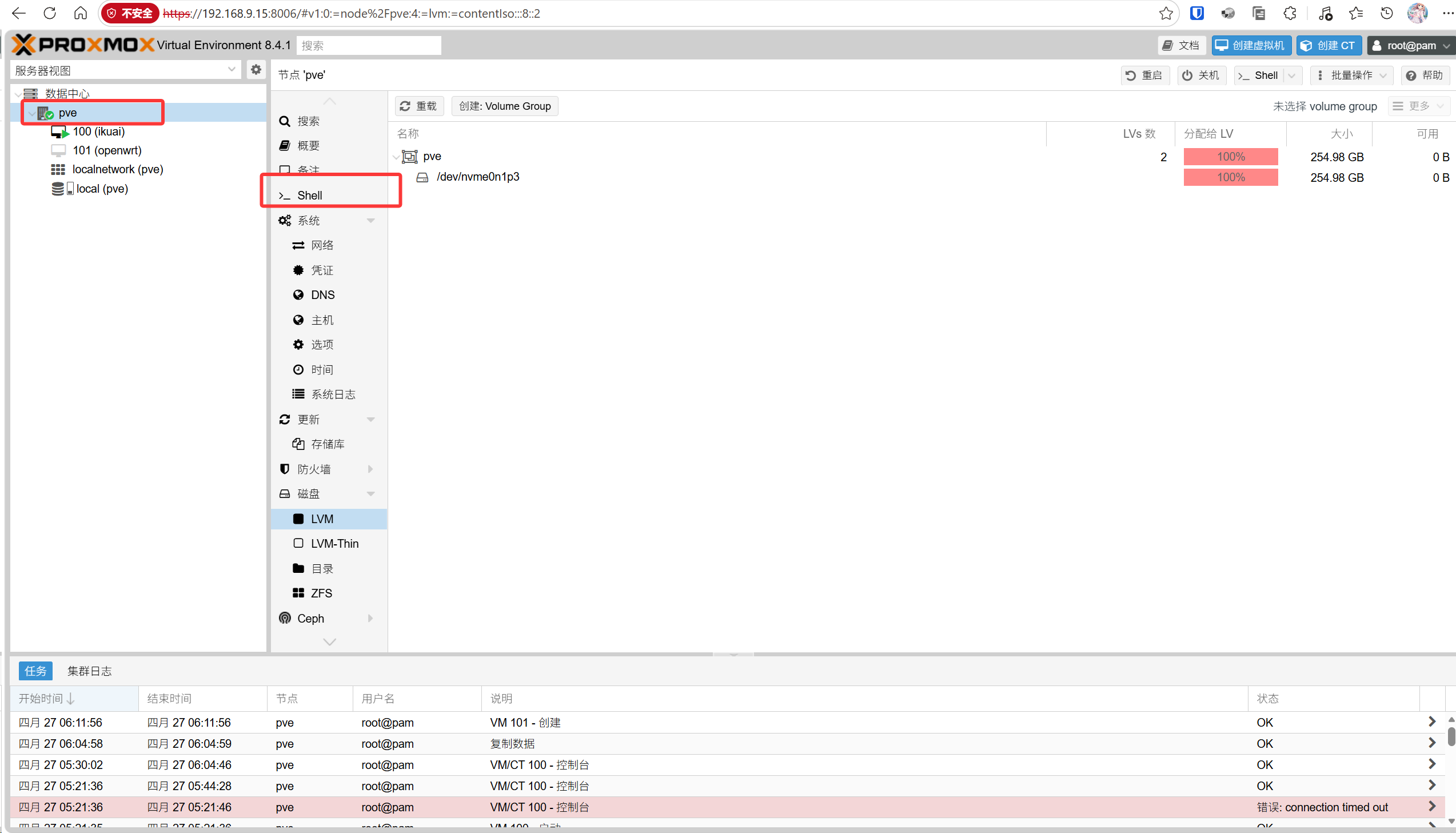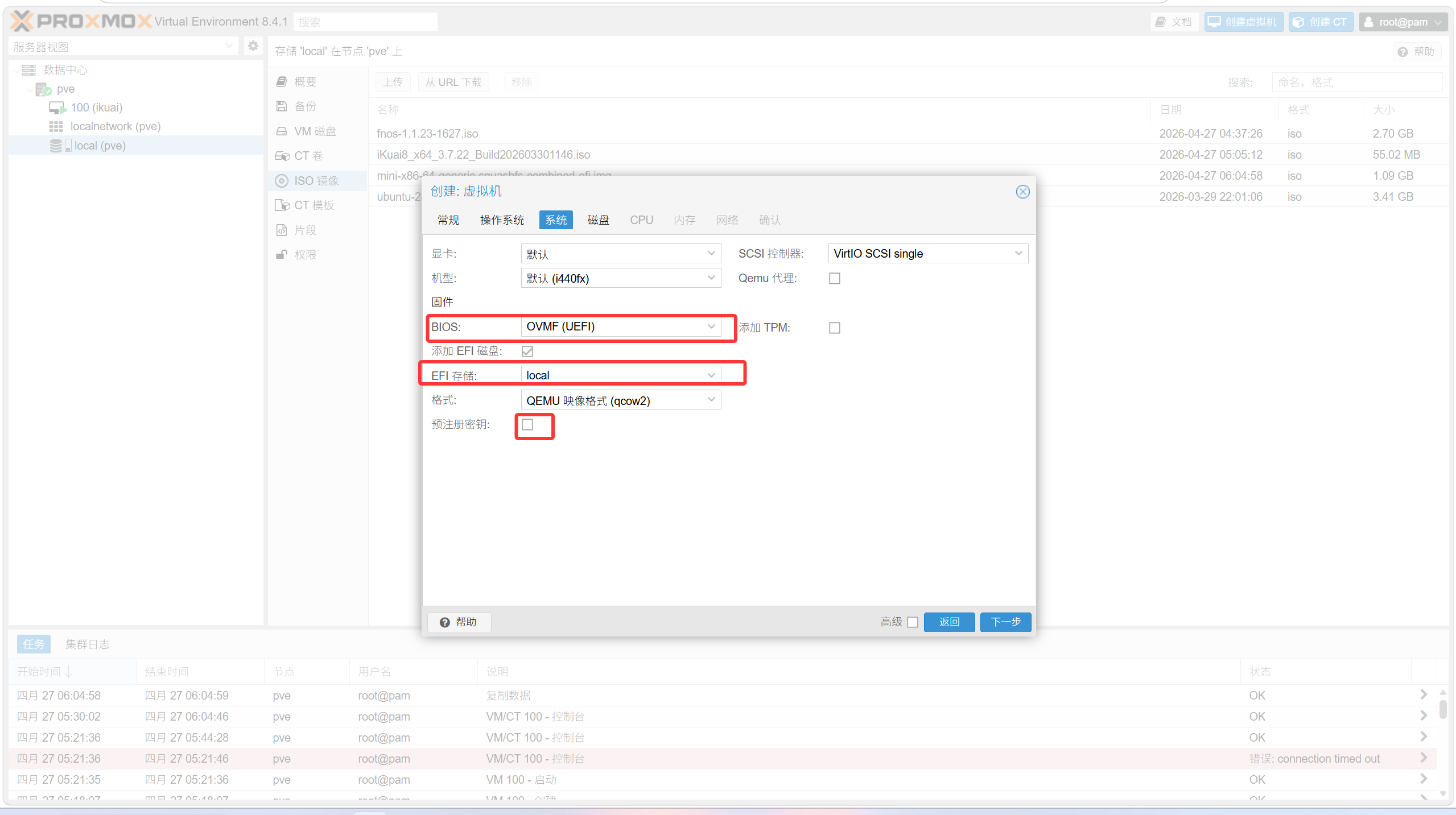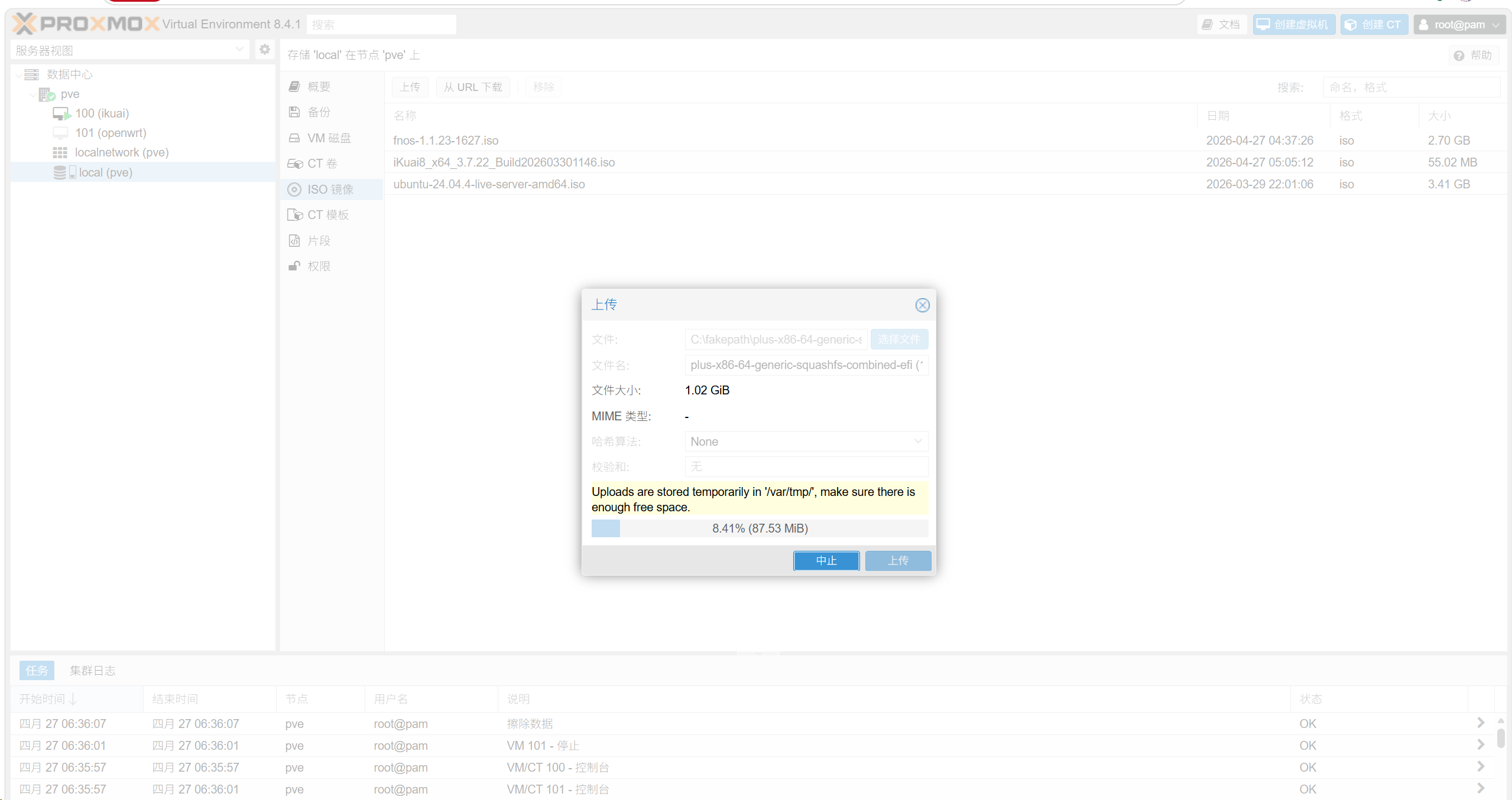 qm importdisk 101 /var/lib/vz/template/iso/plus-x86-64-generic-squashfs-combined-efi.img local虚拟机id为,左侧pve下100 (ikuai) 101 (openwrt)