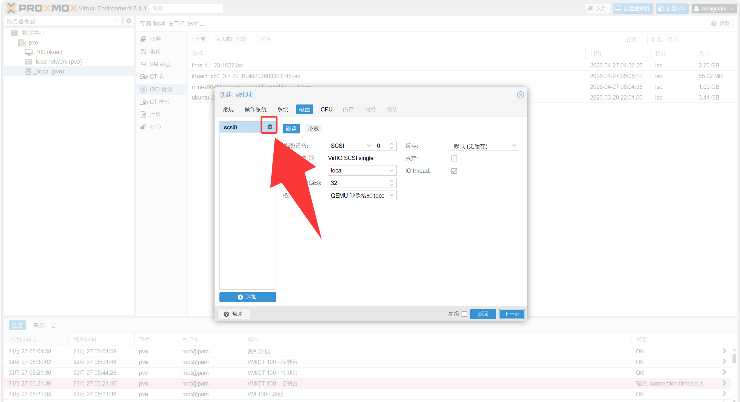qm importdisk 虚拟机ID /var/lib/vz/template/iso/固件名字.img local例如我这个是qm importdisk 101 /var/lib/vz/template/iso/plus-x86-64-generic-squashfs-combined-efi.img local
