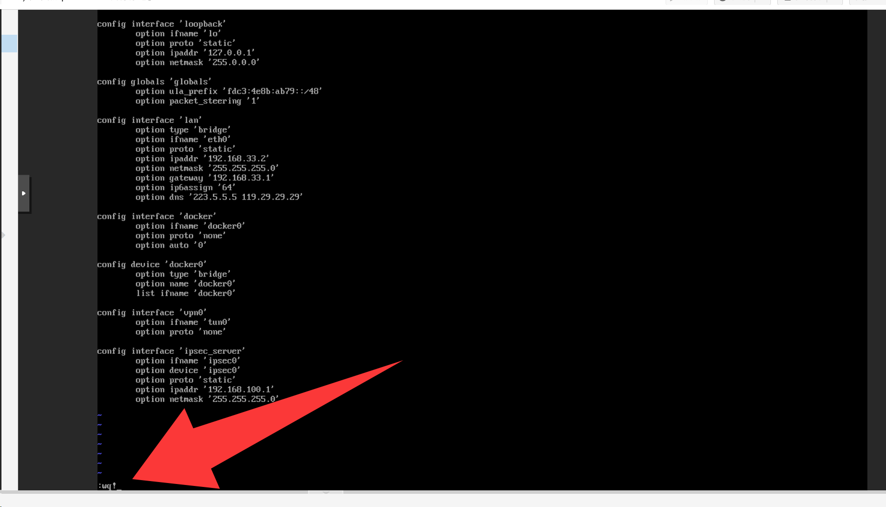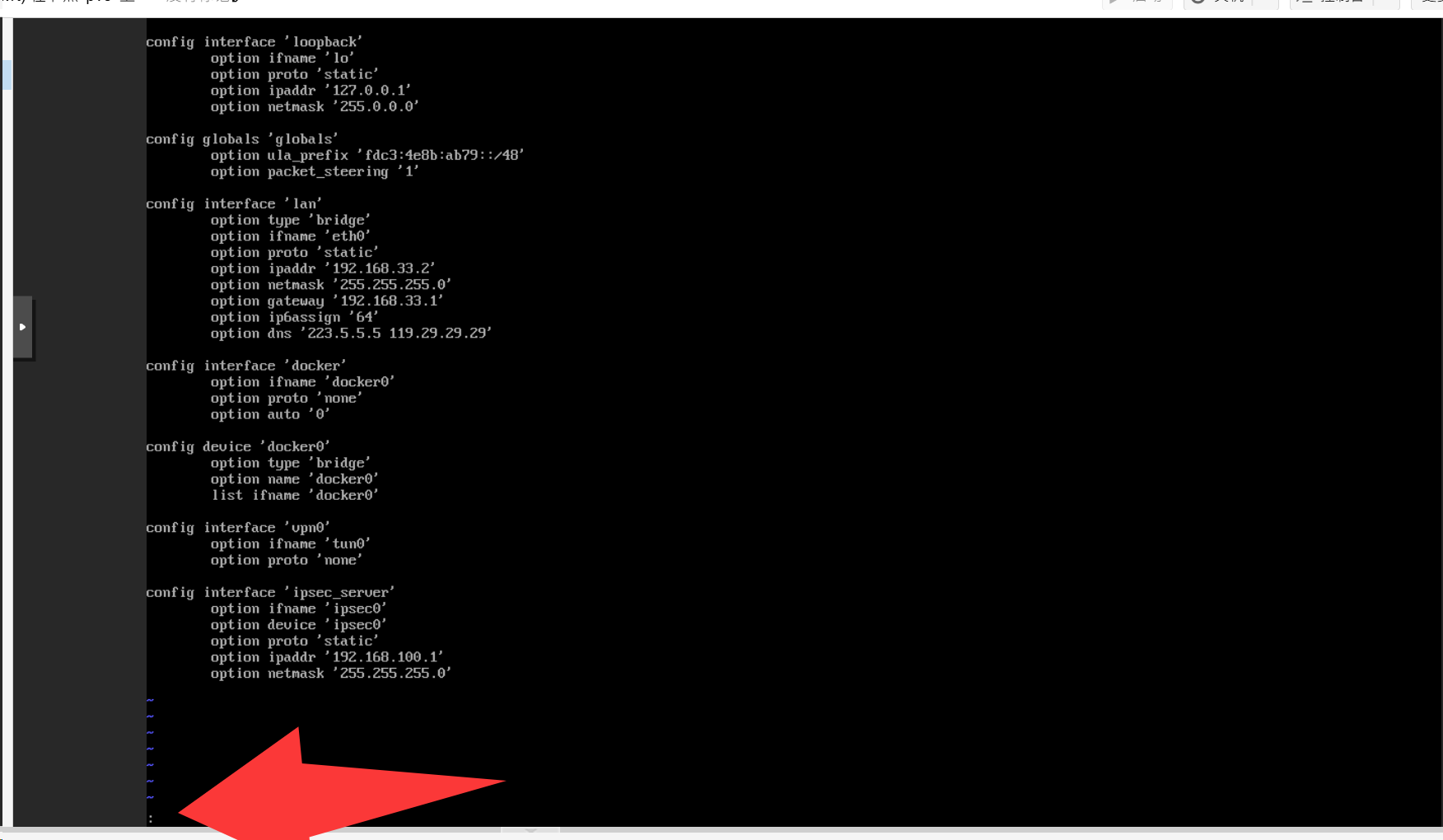 在控制台里输入vi /etc/config/network
