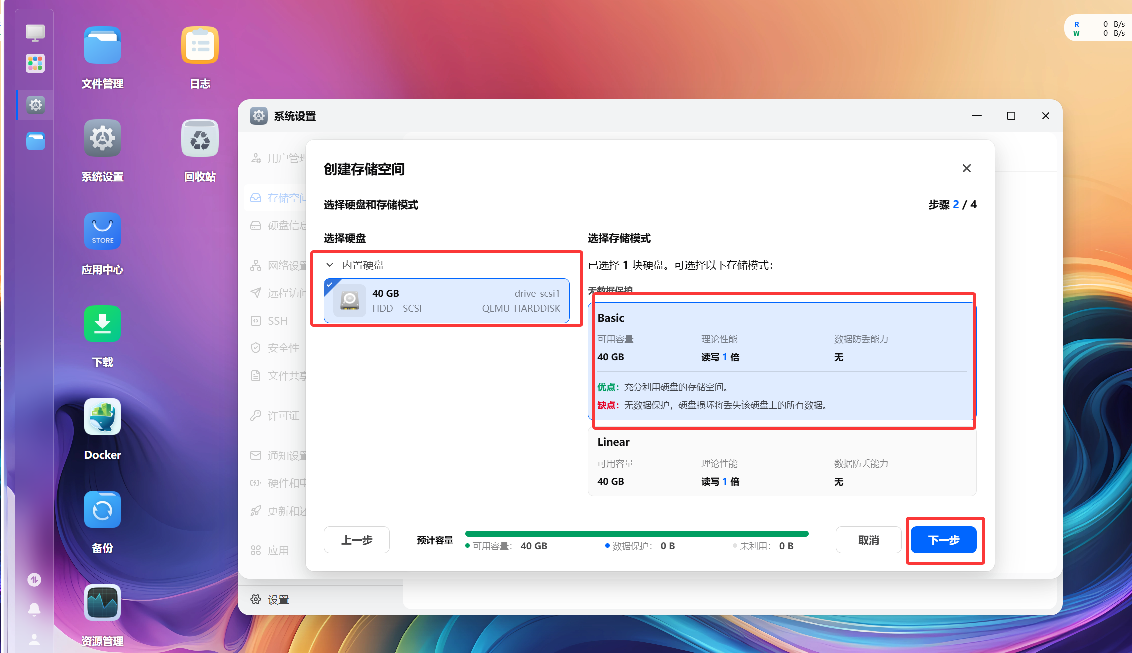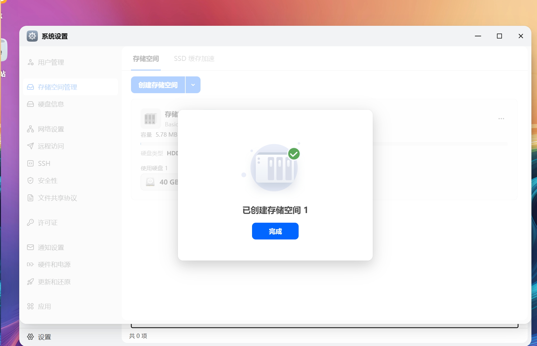 创建存储池 系统设置——存储空间管理——创建存储空间