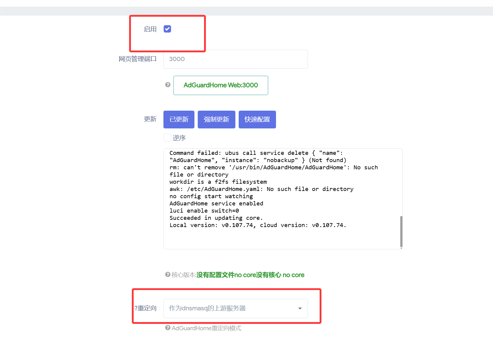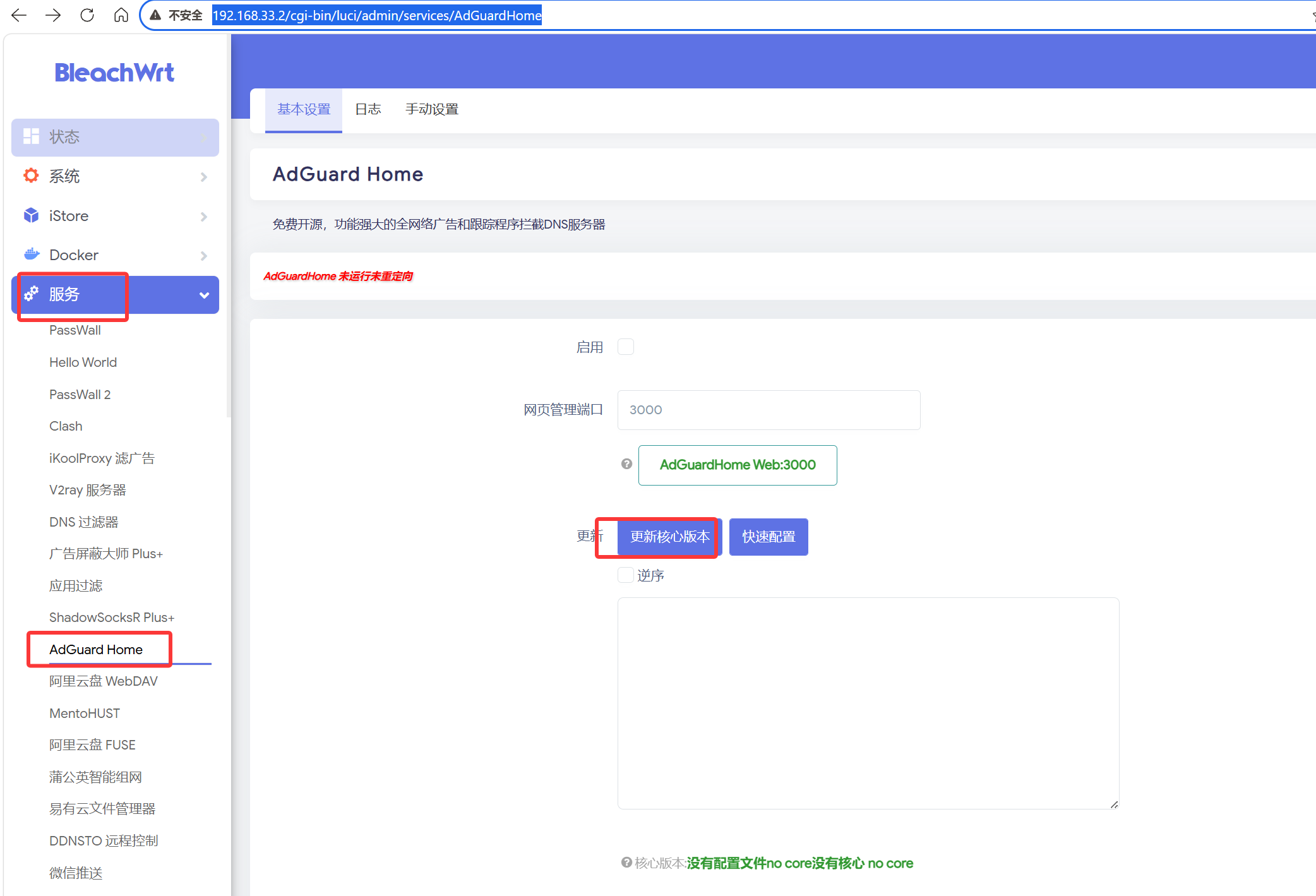 设置adguard——选择服务——找到AdGuard——选择更新核心版本