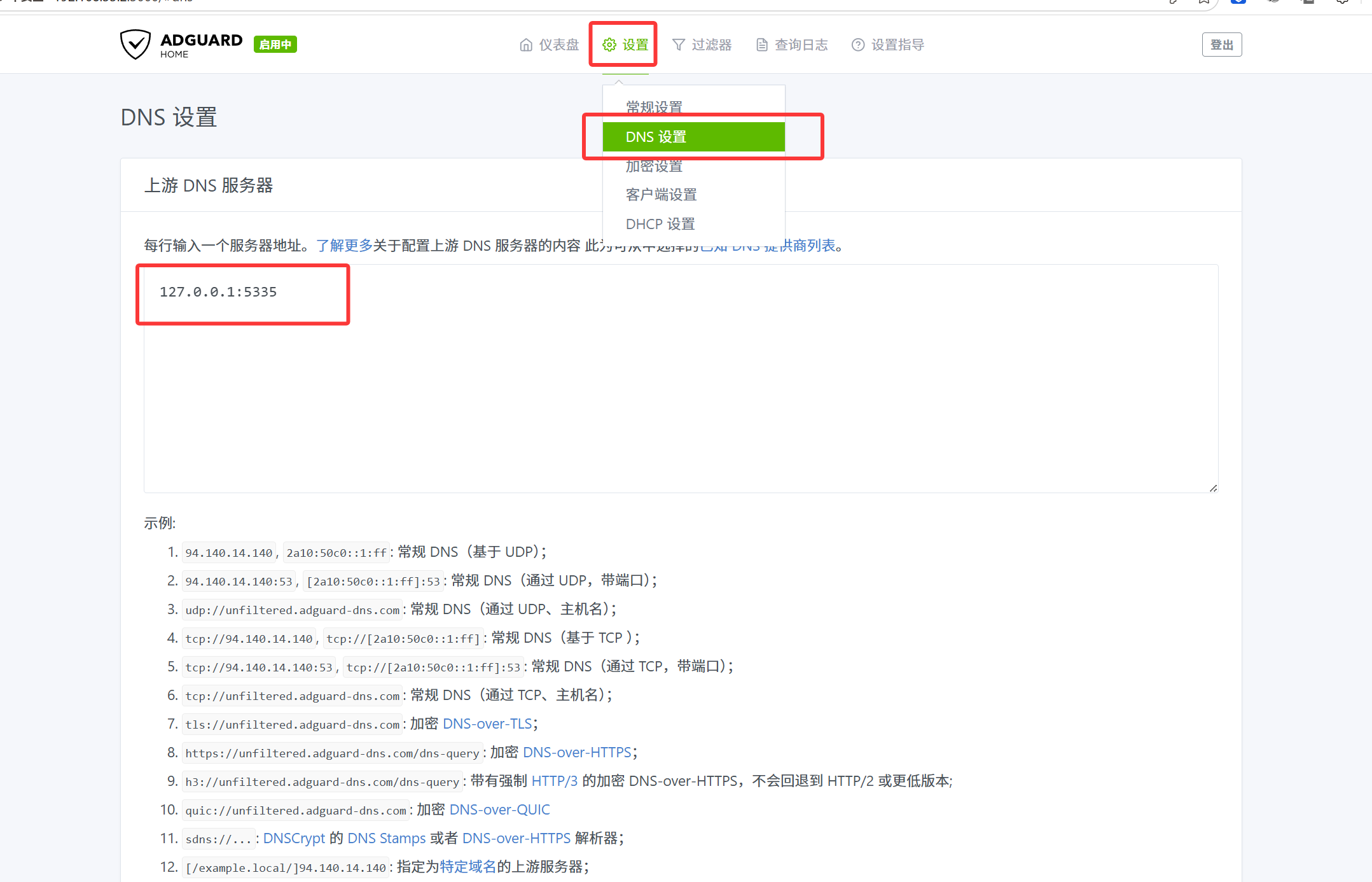 打开仪表盘,点击设置——dns设置——上游dns服务器为127.0.0.1:5335——往下拉点应用