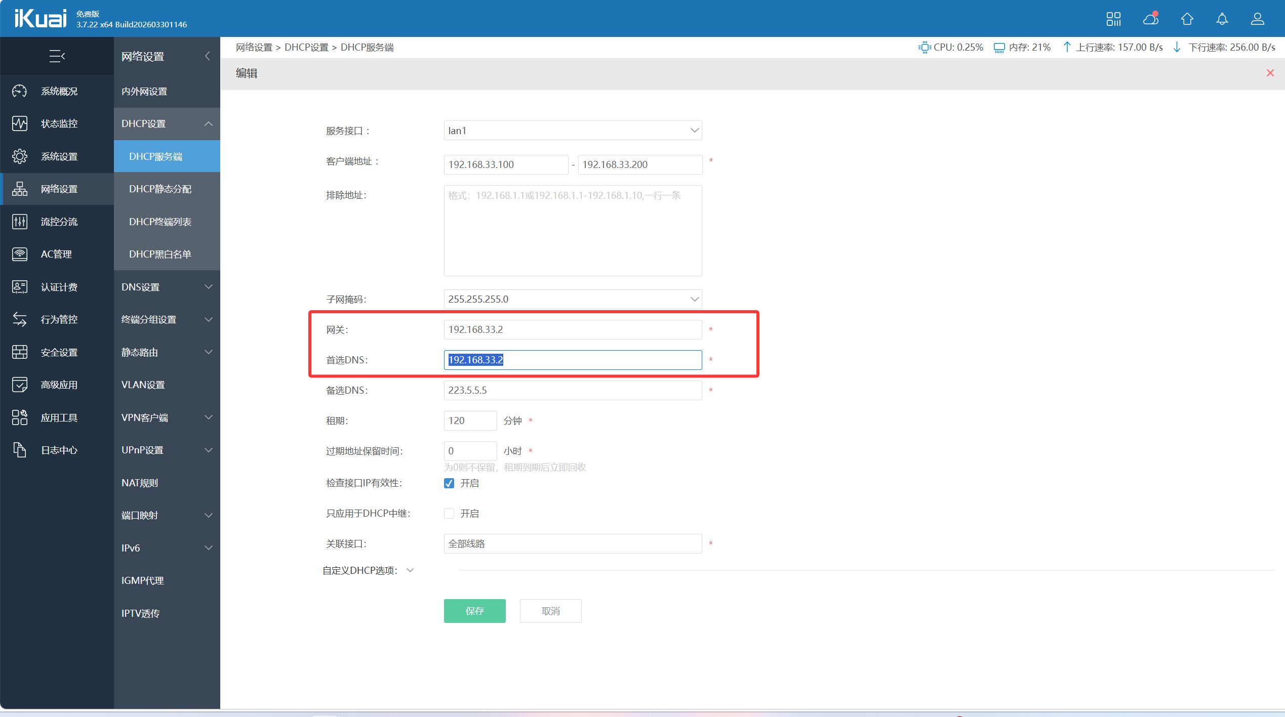 Openwrt配置好之后,需要设置ikuai的DHCP,把dns和王关指向Openwrt打开ikuai——网络设置——DHCP设置——DHCP服务端——编辑将网关和首选DNS改为192.168.33.2,然后点击保存或者你还有其他的方案,例如